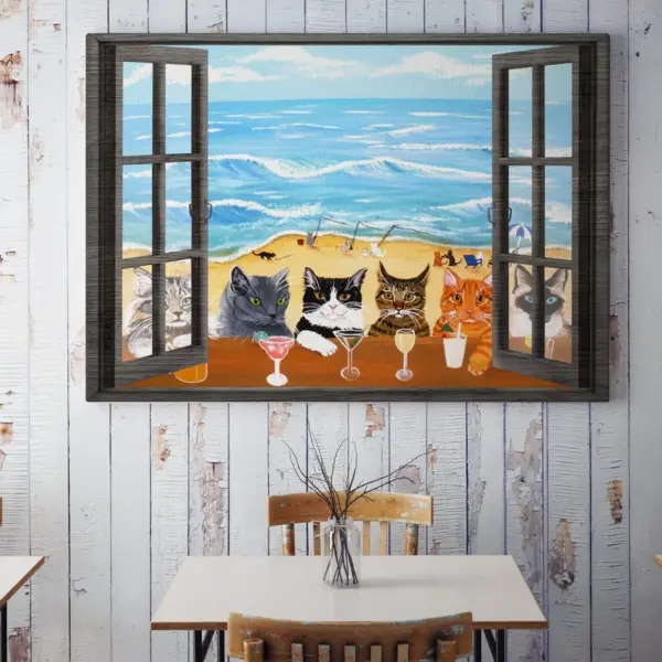 Cats At The Beach Bar Poster And Canvas Cats By The Window Poster Funny Cat Home Decor Cat Lover Gift Cute Cat Wall Art Animal Print