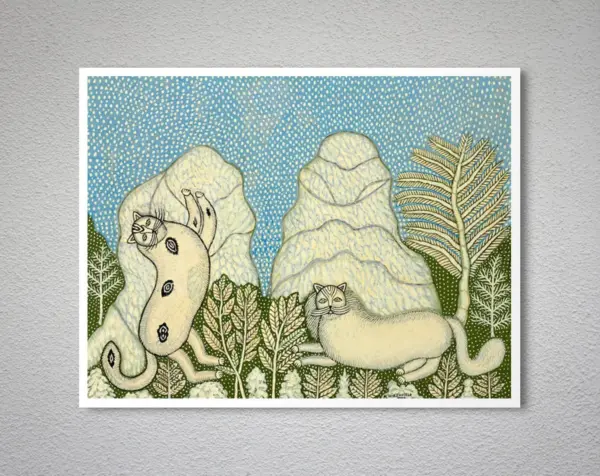 Elegant abstract cat painting capturing a serene winter landscape. Unique fine art print perfect for animal lovers and modern home decor enthusiasts.