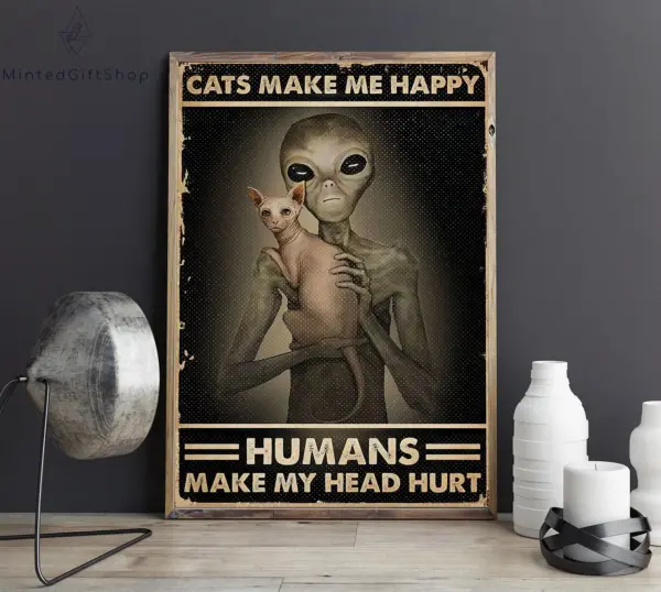 Funny Alien Cat Poster - Cats Make Me Happy Wall Art