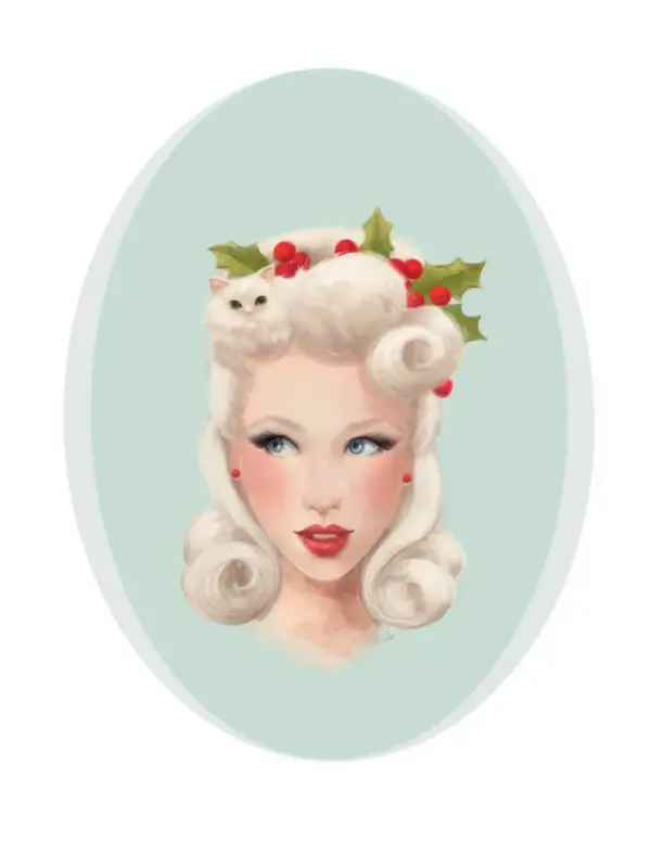 Christmas Vintage Pinup Girl Holly Cat Lover Art Print Poster Fluffy White Kitty