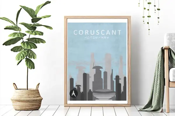 Stylish minimalist Star Wars poster featuring Coruscant. Perfect for sci-fi fans and collectors. Retro travel poster design. High-quality print.