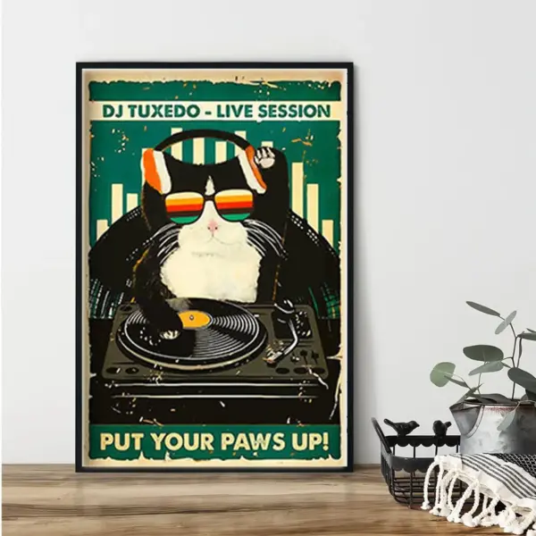 Custom Dj Tuxedo Live Session Put Your Paws Up Poster Black Cat Lover Cat Art Print Dj Poster Music Print Vintage Poster No Frame