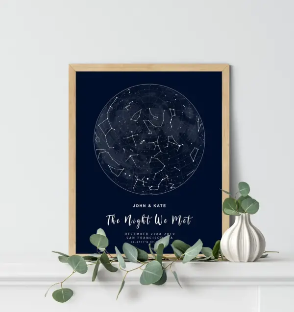 Celebrate your anniversary with a personalized star map showing the night sky on your special date. A unique and romantic gift for him or her, this custom constellation print makes a memorable keepsake.