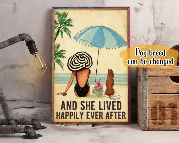 Customized And She Lived Happily Ever After Poster Vintage Girl And Dog Sitting On The Beach Poster Beach Theme Art Wall Decor No Frame