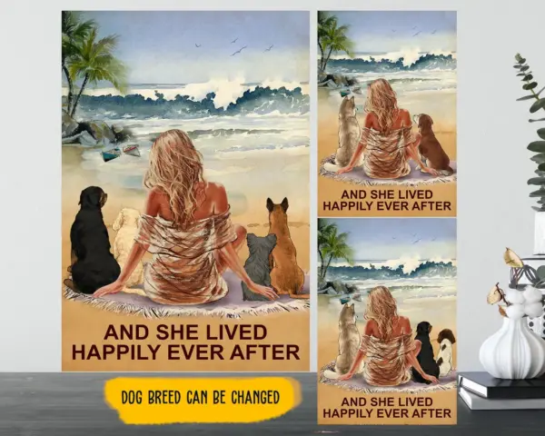 Customized Dogs And Girl At The Beach Art Print And She Lived Happily Ever After Poster Dog Lover Gift Vintage Wall Art No Frame