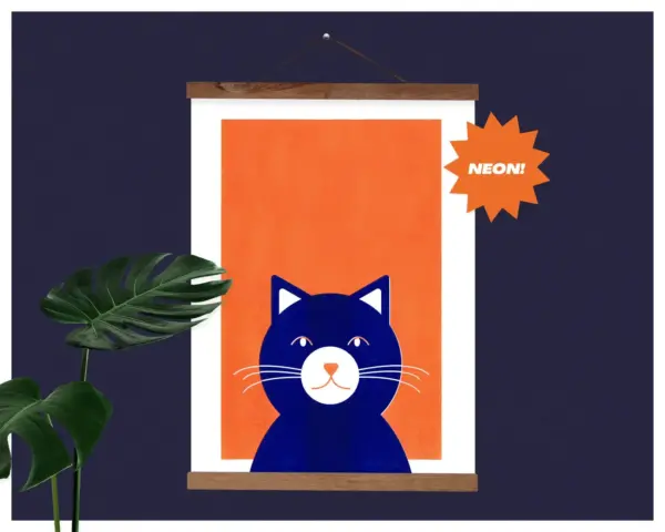 Cute Minimal Cat Neon Orange Blue Risograph Print Cat Wall Decor Unframed