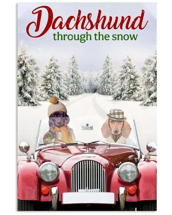 Adorable dachshund winter poster featuring a playful dog in a snowy landscape - perfect holiday decor for dog lovers and pet enthusiasts.