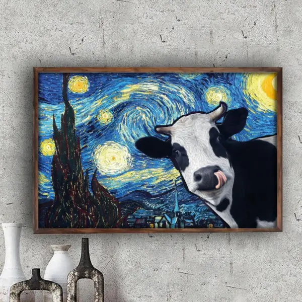 Bring the beauty of Van Gogh's Starry Night to your farm home with this unique dairy cow poster. High-quality print, perfect wall art.