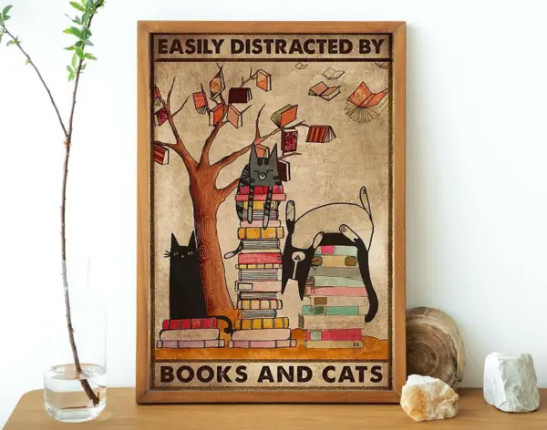 Easily Distracted By Books And Cats Poster Retro Cat Poster Cats And Books Lover Poster No Frame