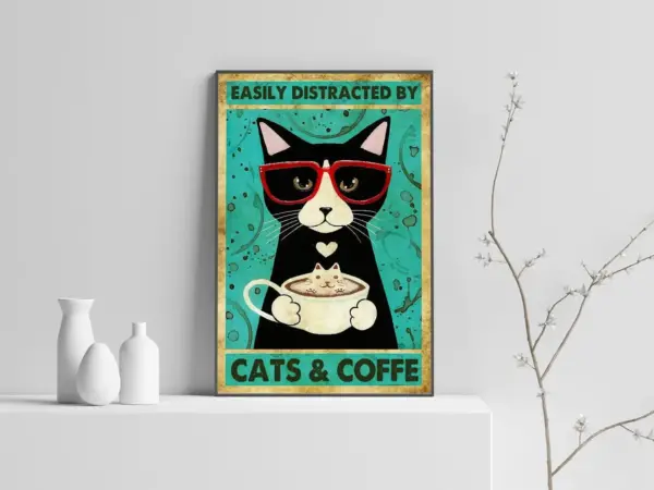 Easily Distracted By Cats And Coffee Poster Coffee Wall Art Canvas Art Cat Poster Kitty Art Print Cat Lover Gift Signs For Home
