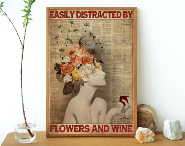 Easily Distracted By Flowers And Wine Poster Pot Head Wall Art Floral Girl Art Girl Drinks Wine Love Flowers Vertical Poster No Framed