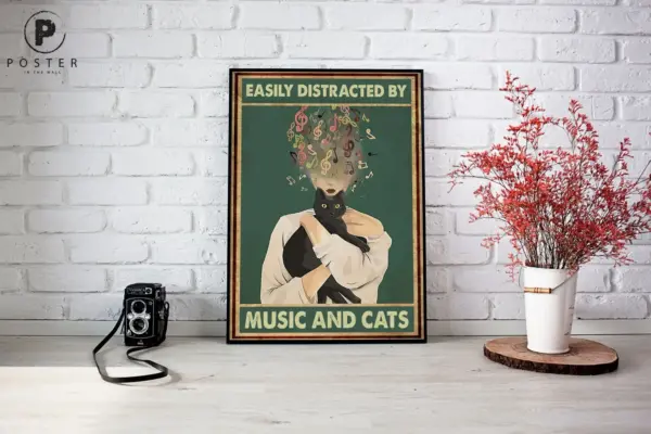 Easily Distracted By Music And Cats Poster Cat Poster Print Wall Art Cat Lover Gift Wall Decor Black Cat Poster Hanging Poster Best Gift