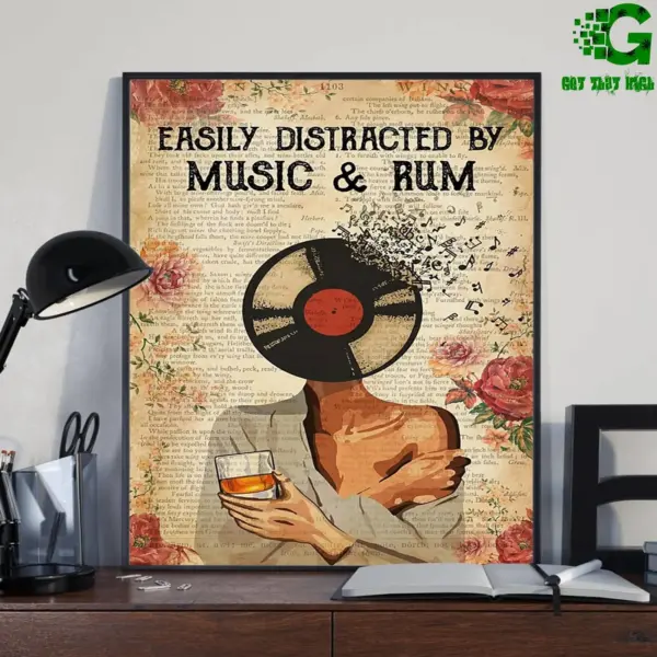 Easily Distracted By Music And Rum Poster Wine Lovers Wall Art Living Home Decor Wall Decor Best Gift Ever