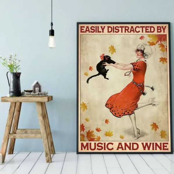 Easily Distracted By Music And Wine Poster Black Cat Wall Art Girl Dancing With Cat Cat Lover Gift Love Music Print Best Gifts Ever