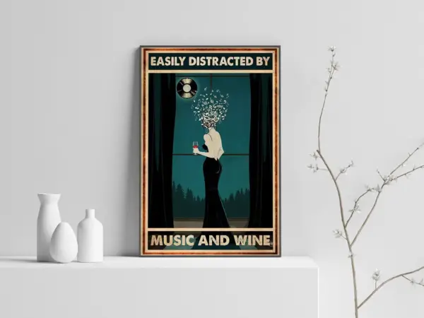 Easily Distracted By Music And Wine Poster Music Poster Vinyl Poster Wall Art Retro Music Art Music Print Lover Signs For Home