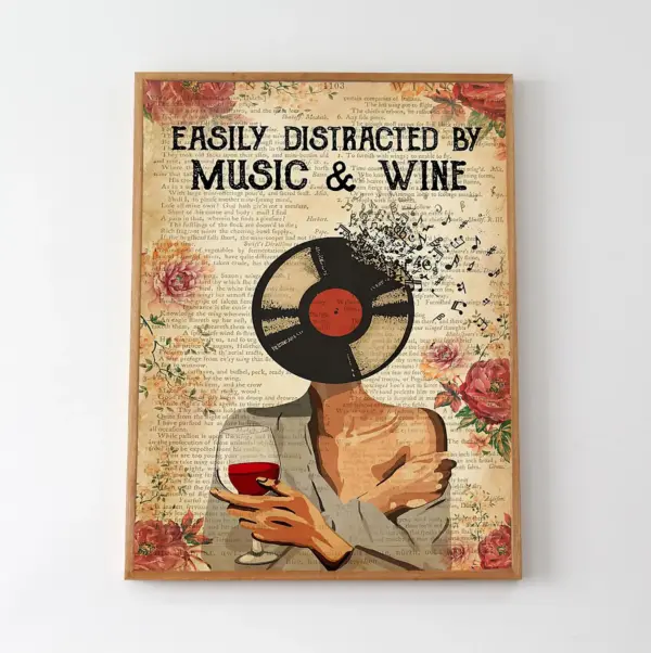 Easily Distracted By Music And Wine Poster Vinyl Wall Art Music Gift Vintage Music Canvas Wall Art Gift For Vinyl Lover Vinyl Wall Art