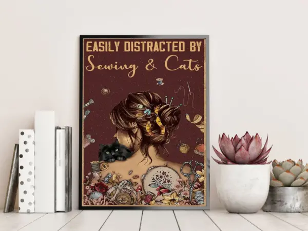 Easily Distracted By Sewing And Cats Vertical Poster Cat Vertical Art Print Black Cat Art Wall Sewing Lovers Poster