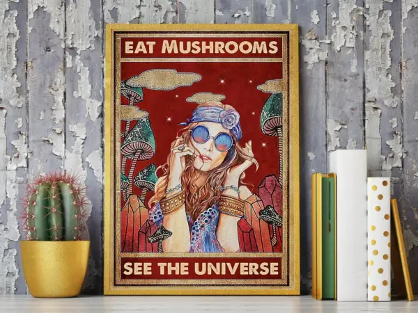 Eat Mushrooms See The Universe Poster Hippie Girl Poster Trippy Wall Decor Hippie Art Print Mushroom Poster Psychedelic Trippy Poster