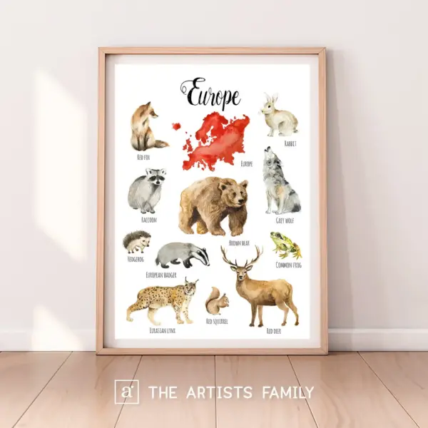 Europe Continent Animals Downloadable Prints Watercolor Montessori Educational Kids Boys Girls Children Learning Painting Illustration
