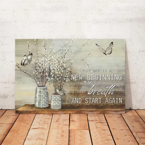 Inspiring canvas flower vase poster. Perfect motivational wall art for home decor. Adds a touch of serenity and positivity to your space. Deep breath, new beginning.