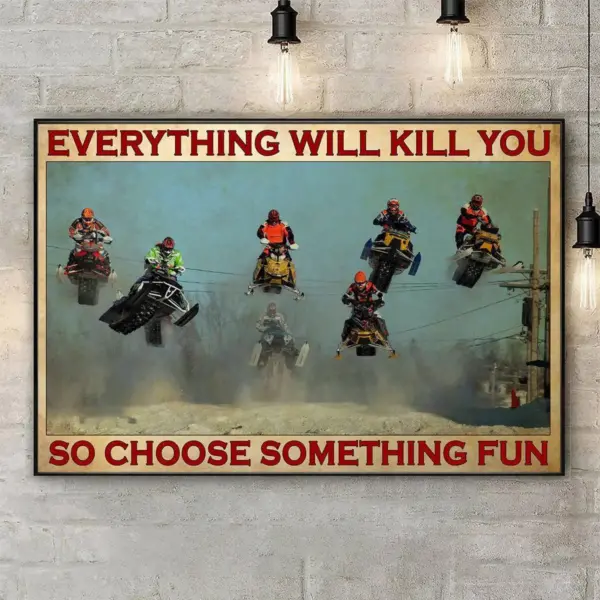 Unique motivational poster featuring a witty life quote alongside exciting snowmobile racing imagery, perfect for adventure enthusiasts and home decor.