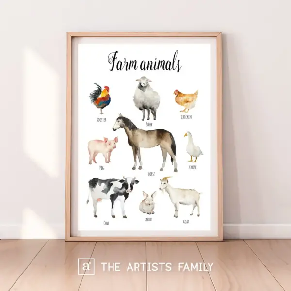 Farm Animals Downloadable Prints Watercolor Montessori Educational Posters Kids Boys Girls Children Rooms Learning Painting Illustration