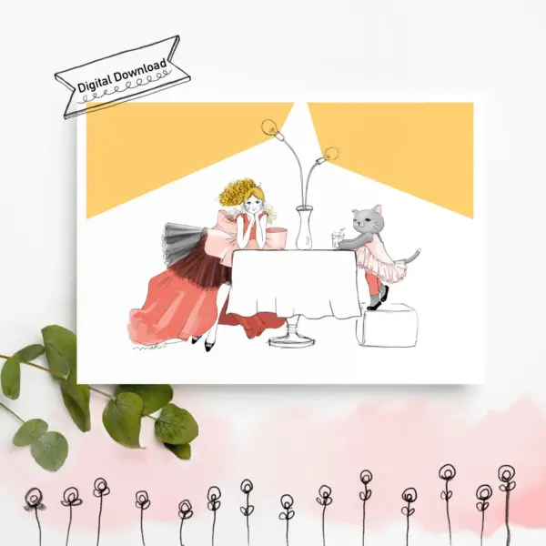Fashion Illustrations Cafe Girly Wall Art Greeting Card Girls And Cats Printable Art Poster