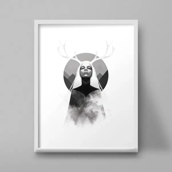 Female Portrait Art Print Antlers Painting Nature Mountains Black And White