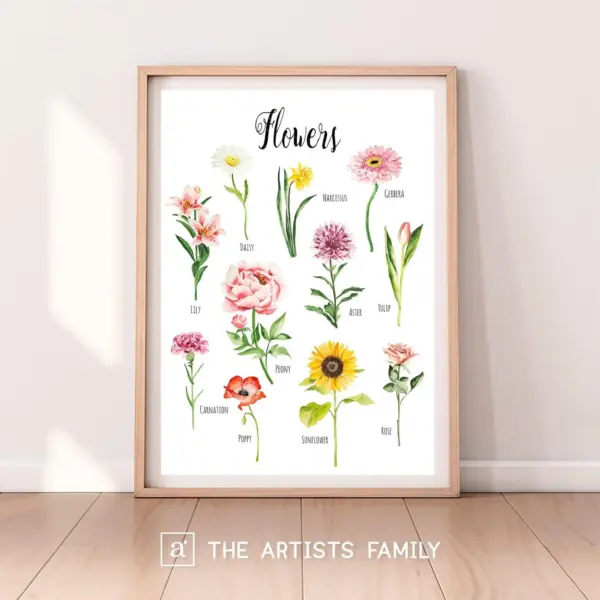 Flowers Downloadable Prints Watercolor Montessori Educational Poster Kids Boys Girls Children Rooms Learning Illustration Homeschool Rose
