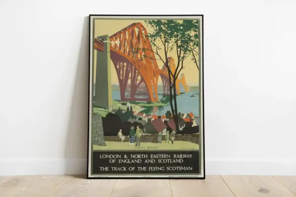 High-quality vintage travel poster of the Forth Bridge, Scotland. Available as a canvas print or poster, perfect for wall decor. Add a touch of Scottish charm to your home!