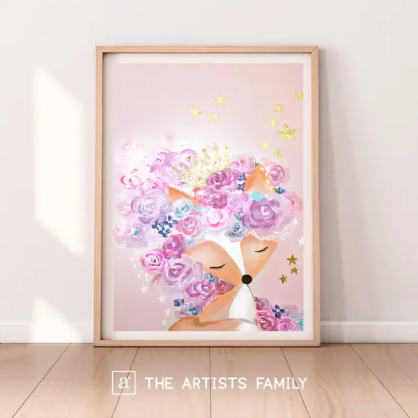 Fox Princess Nursery Print Decor Illustration Downloadable Prints Wall Art Painting Printable Kid Baby Girl Room Pink Flower Digital Stars