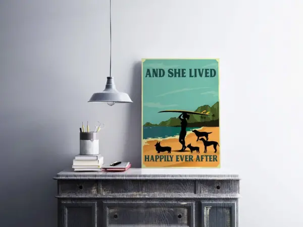 Funny Dog Poster And She Lived Happily Ever After Tropical Home Decor Girl Surfing Poster Surfer Gift Dog Lover Gift Dog Canvas Wall Art