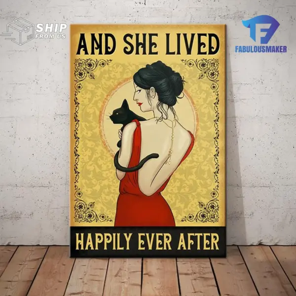 Gift For Black Cat Lovers And She Lived Happily Coffee Shop Canvas Wall Art Cat Canvas Bathroom Home Living Decor Poster Canvas