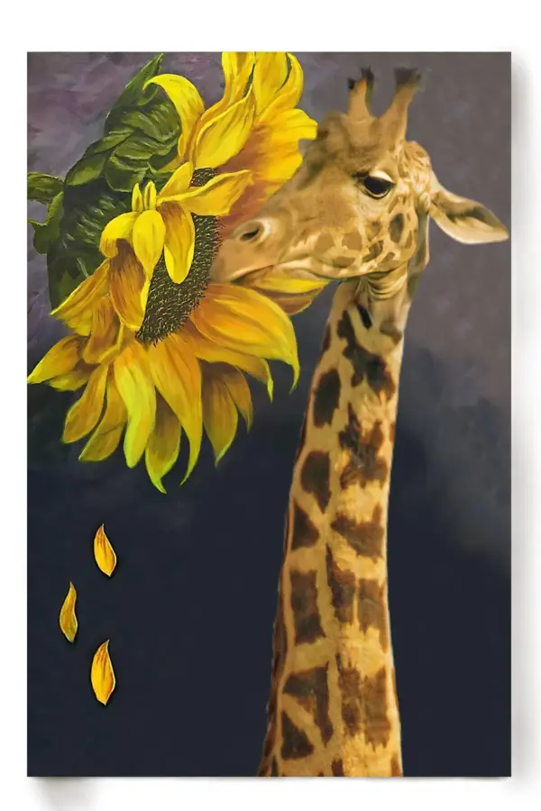 Unique wildlife art print featuring a giraffe beside a sunflower, perfect for zoologists, animal enthusiasts, and nature-inspired home decor.