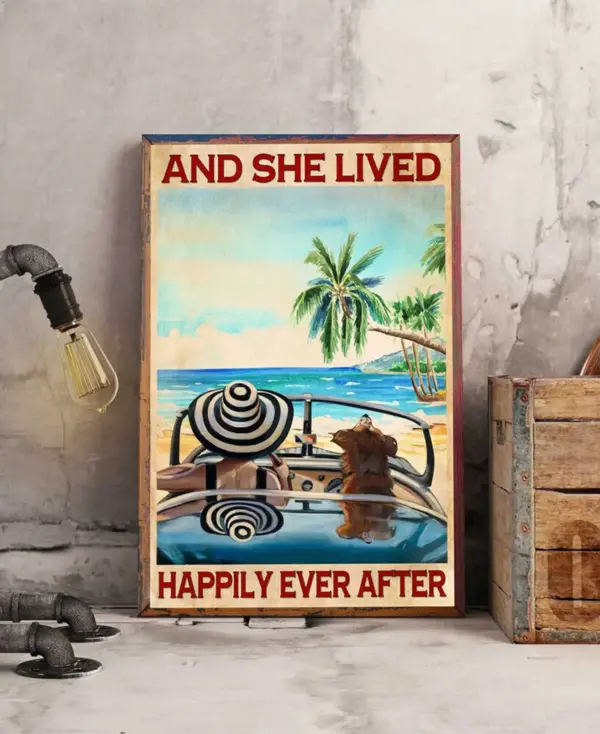 Girl And Dog At Beach In Summer Poster And She Lived Happily Ever After Poster Vintage Beach Print Lovely Girl Print Dog Lovers Gift
