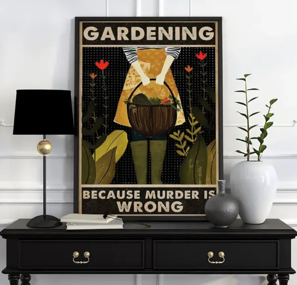 Girl Gardening Because Murder Is Wrong Poster Garden Poster Botanical Canvas Print Plant Lover Gift Vintage Poster Floral Illustration