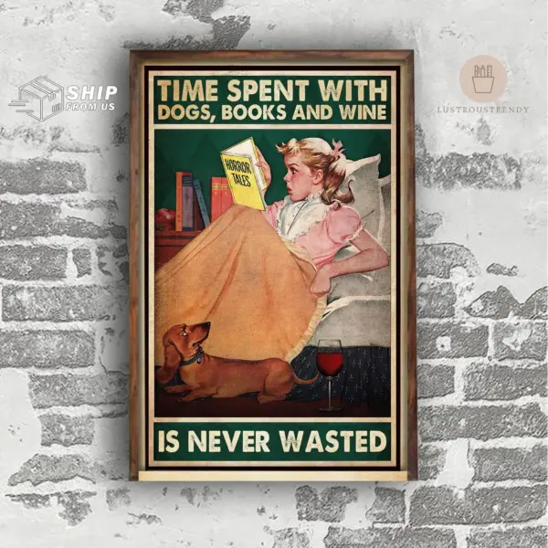 Girl Love Dachshund Dog Book And Wine Poster Time Spent With Dogs Books And Wine Is Never Wasted Poster Home Living Decor Poster
