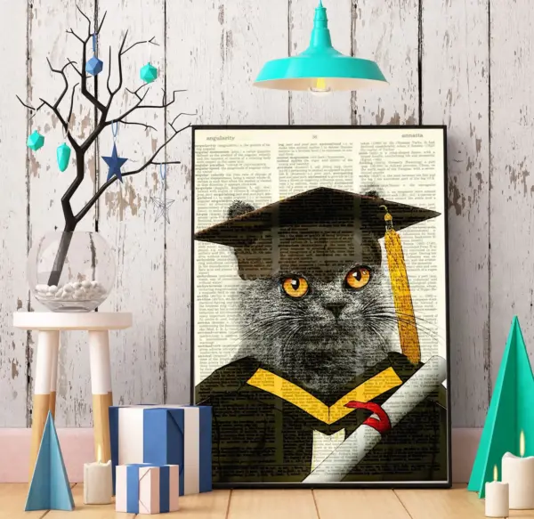 Graduation Cat With Cap Gown And Diploma Beautifully Upcycled Dictionary Page Book Art Print Cat Vertical Art Print