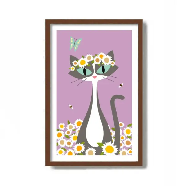 Grey And White Cat Art Print Daisy Flower Crown Fairy Garden Cat Gardening Gift Gardener Gift Mid Century Modern Wall Art Cat Lover Gift