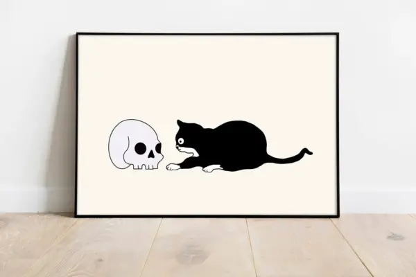 Cute black cat staring at a skull! Download this funny Halloween printable wall art JPG & PNG for instant spooky decor. Perfect for October festivities.
