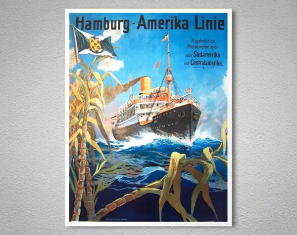 High-quality vintage travel posters featuring the Hamburg Amerika Linie, showcasing the beauty of South and Central America. Available as prints, stickers, or canvas art. Perfect gift!