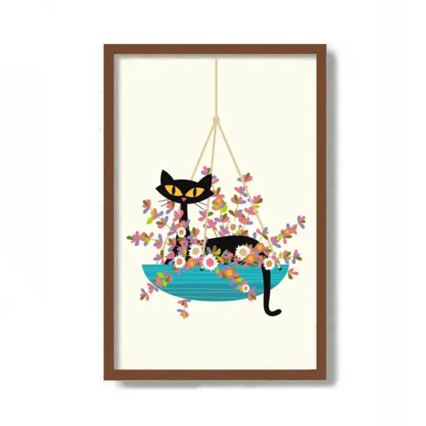 Hanging Flower Basket Planter Black Cat Art Print Garden Cat Gardening Decor Gardener Gift Mid Century Modern Wall Art Cat Lover Gift