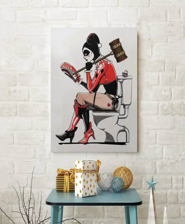 Harley Quinn On The Toilet Poster Harley Quinn Art Funny Harley Quinn Canvas Print Funny Bathroom Decor Bathroom Poster Funny Decor