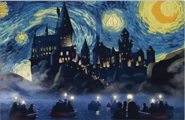 Beautiful Van Gogh Starry Night poster featuring Hogwarts. High-quality print, perfect for Harry Potter & art lovers.