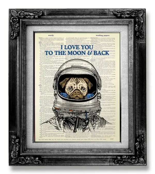 I Love You To The Moon And Back Anniversary Gift For Man Boyfriend Love Poster Unique Engagement Gift Husband Pug Art Print Old Book Art