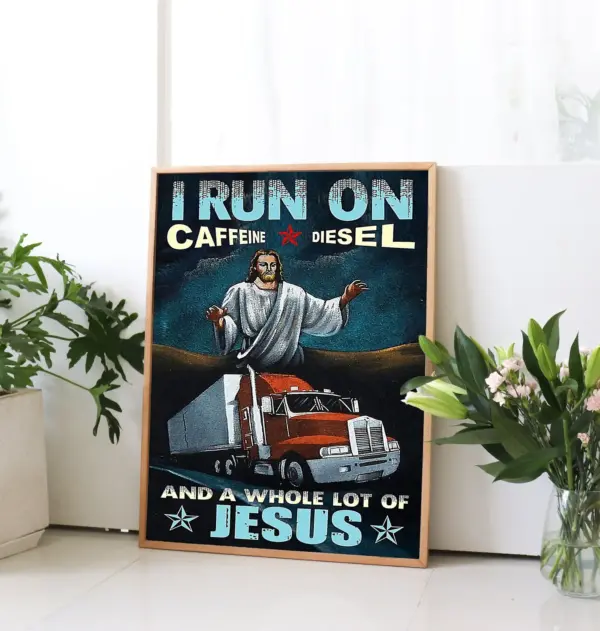 I Run On Caffeine Diesel And A Whole Lot Of Jesus Poster Trucker Lifestyle Poster Trucker Knowledge Poster Trucker Home Decor