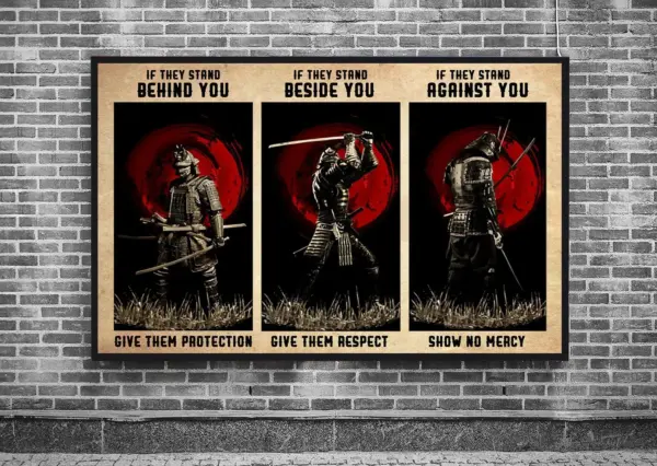 Powerful samurai philosophy poster featuring a bold motivational quote about respect, protection, and warrior wisdom - perfect for home or office decor