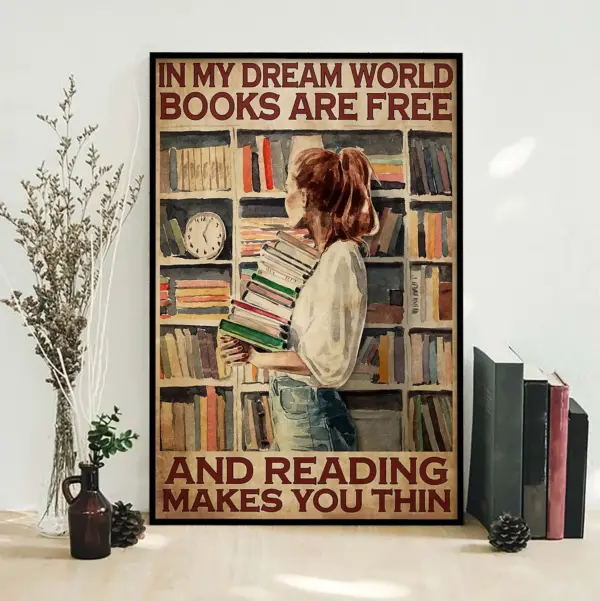 In My Dream World Books Are Free And Reading Makes You Thin Poster Love Reading Poster Wall Art Decor Girl And Books Print 0702