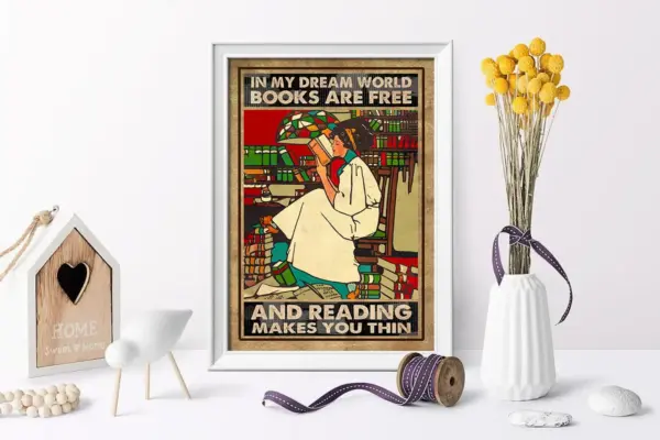 In My Dream World Books Are Free Reading Makes You Thin Poster Vintage Book Poster Reading Book Poster Reading Lover Book Wall Hanging