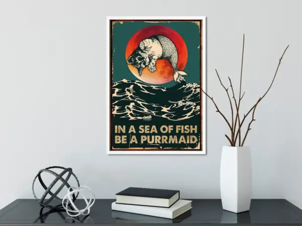 Adorable vintage cat poster featuring a purrmaid design. Perfect home decor, available as a poster or canvas wall art. Great gift for cat lovers!